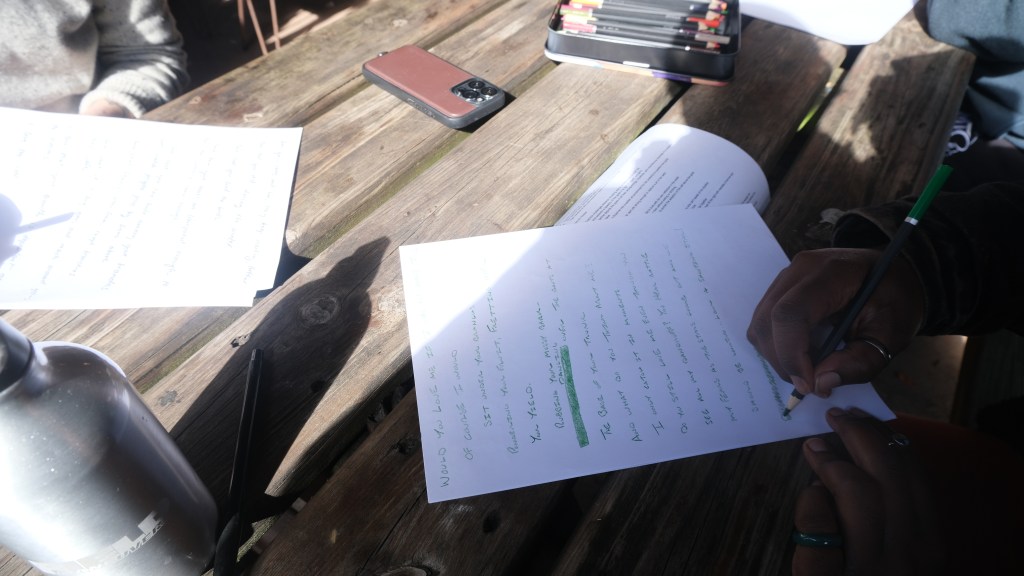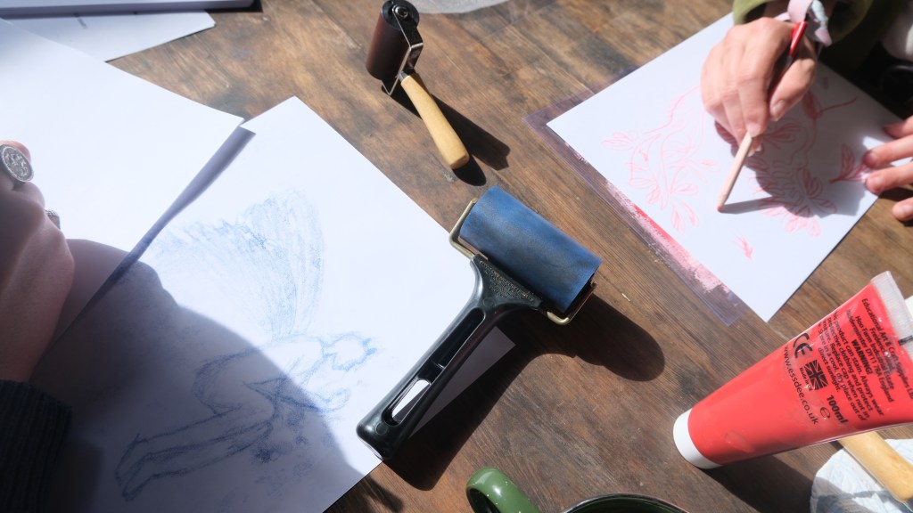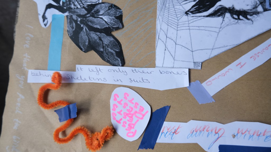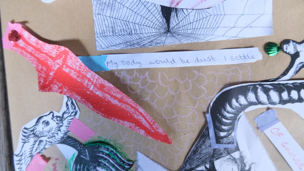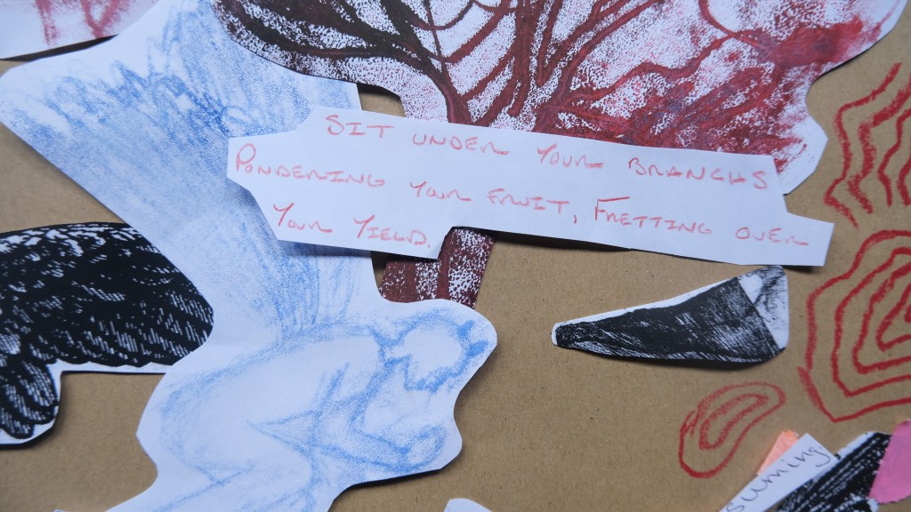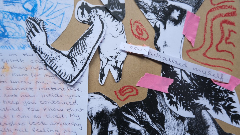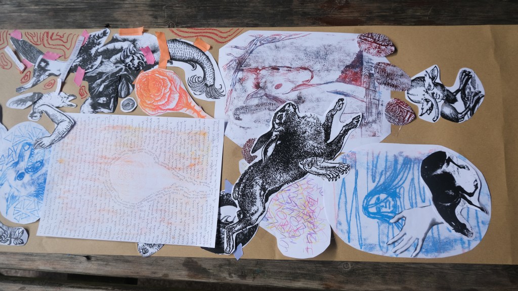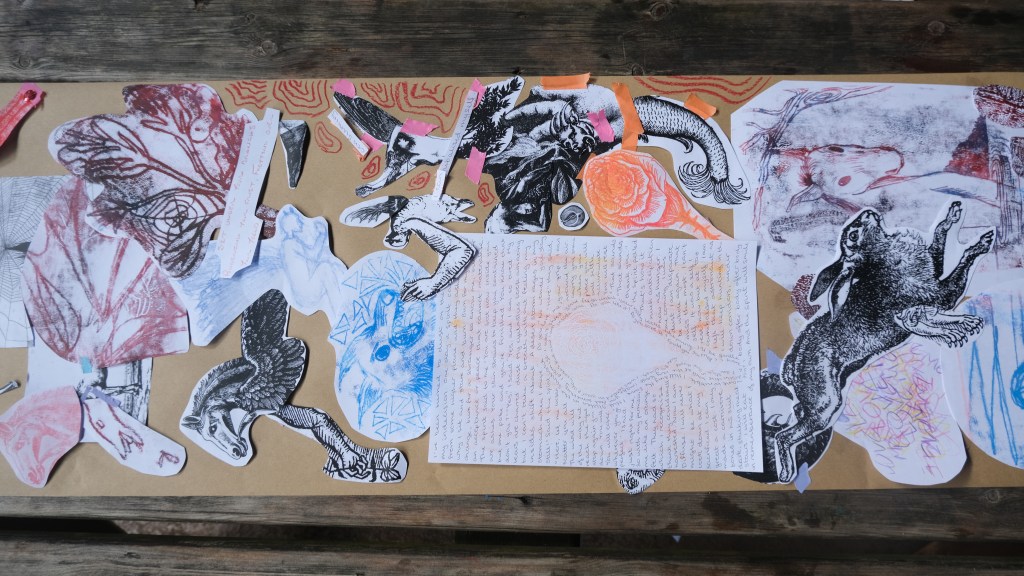 The first installation of this project was a combined printmaking, collage, and writing workshop co-facilitated with Mithago Craze at Camp Trans 2025. The session culminated in a collective collage of prints, and words around the themes.