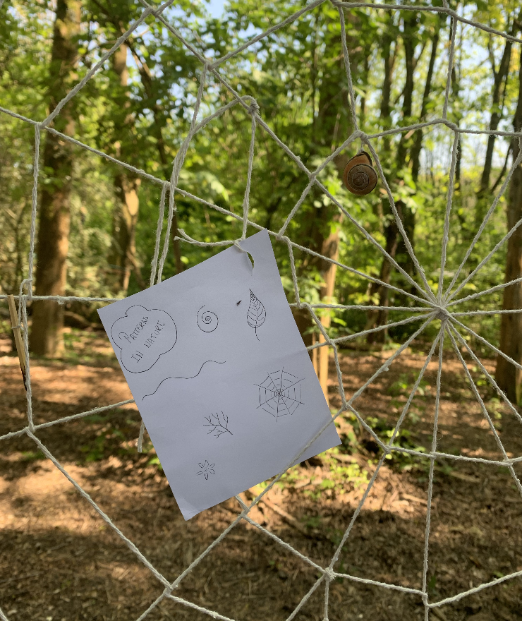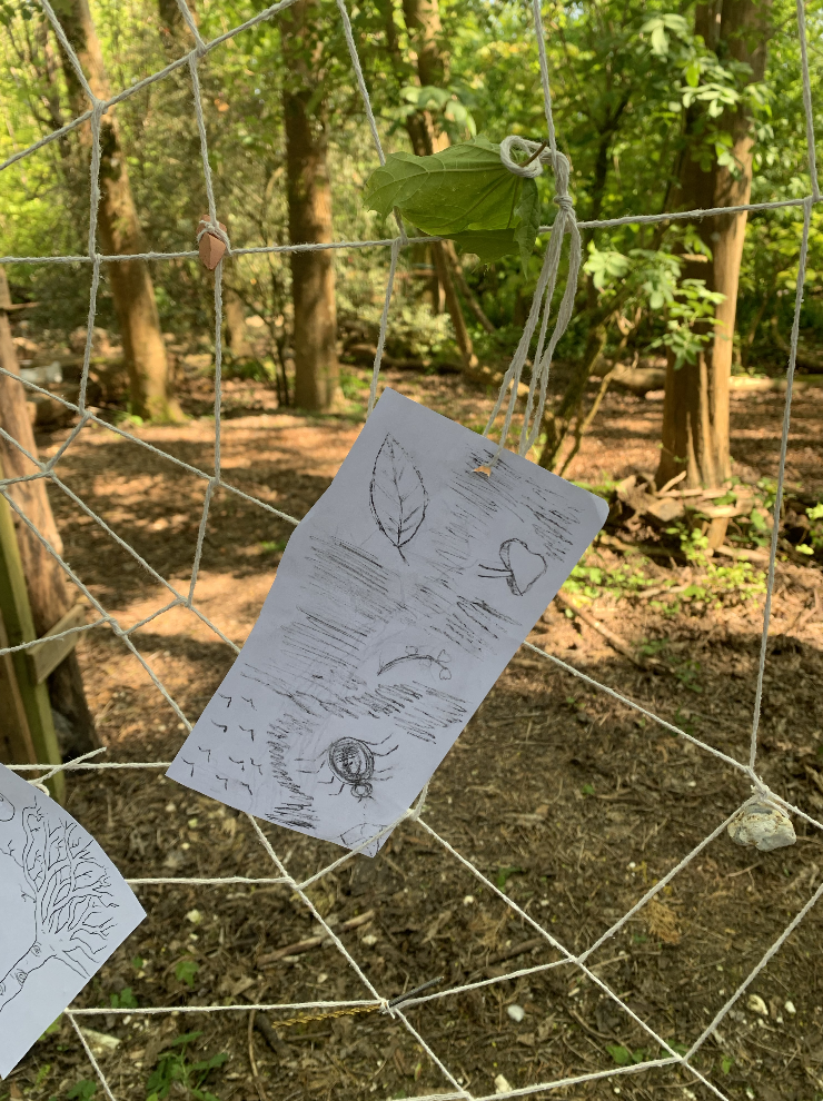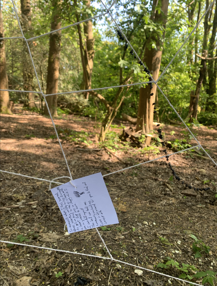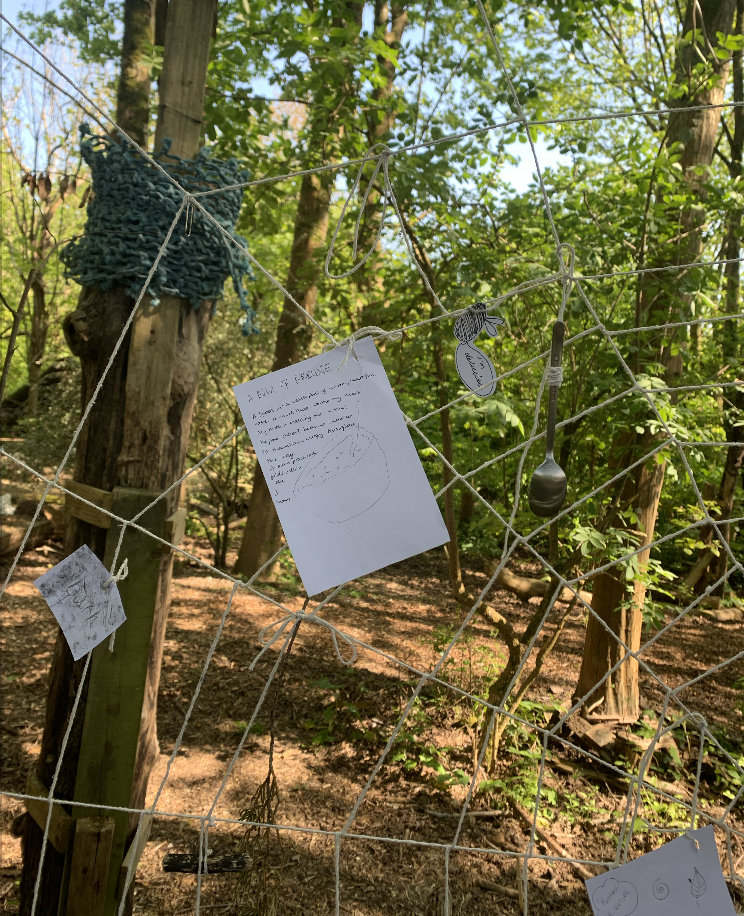 At the Future Roots plot in Stanmer Park, for the Rooted Beings event, I created a participatory web installation. I had already attached a series of found natural and unnatural objects, writings, and drawings onto the web, woven between two trees. I invited participants to add to the web with found objects, writings, and drawings. I invited them to reflect on the meaning of objects in storytelling, and how assemblage of objects can tell a bigger story with how they are pieced together.