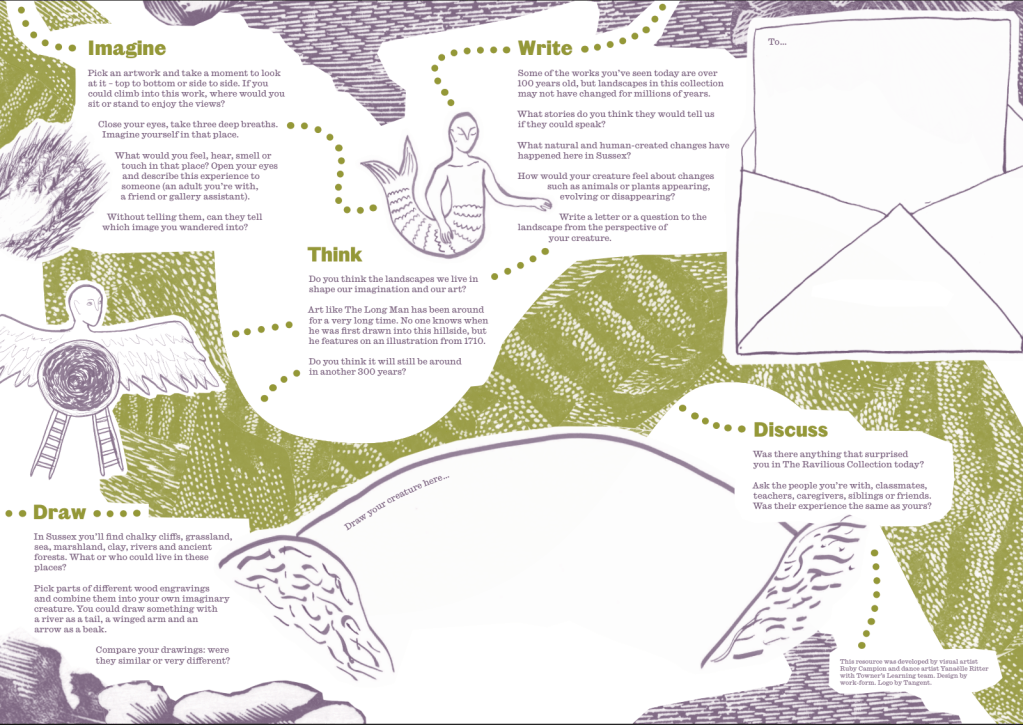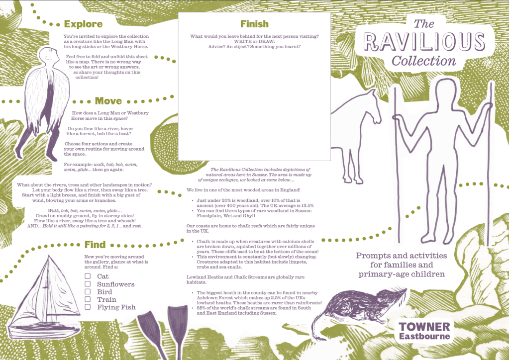 We invited children and families to explore the collection of landscape and sussex inspired works as though journeying through and exploring the landscapes and places themselves. The recource encourages reflection on sense of place and it’s changes over time, our relationship with nature , and the stories and lives the landscape holds.